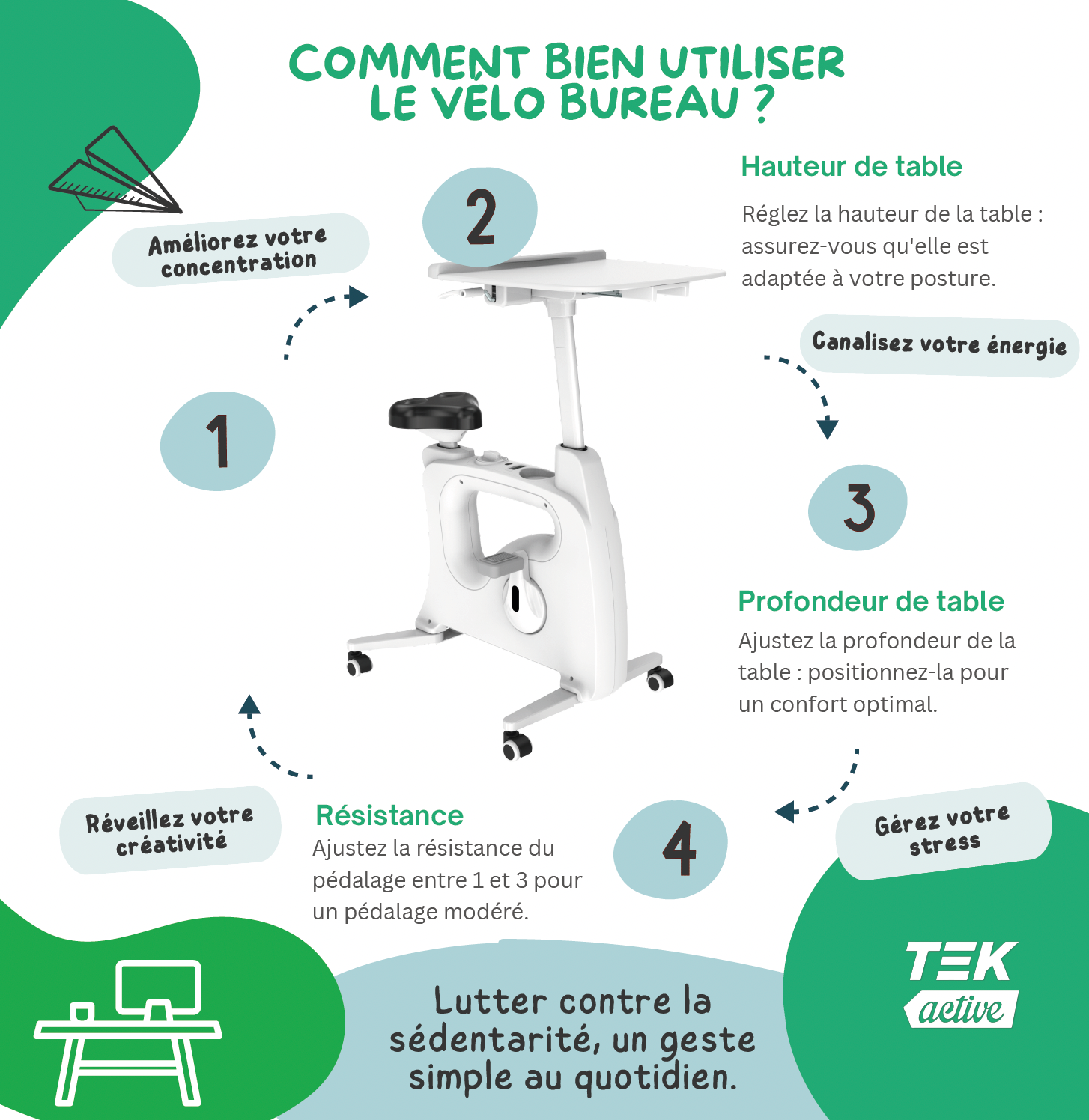 Alliez mouvement et productivité avec le vélo-bureau. Silencieux, fiable et intuitif, il permet de pédaler sans effort tout en travaillant.