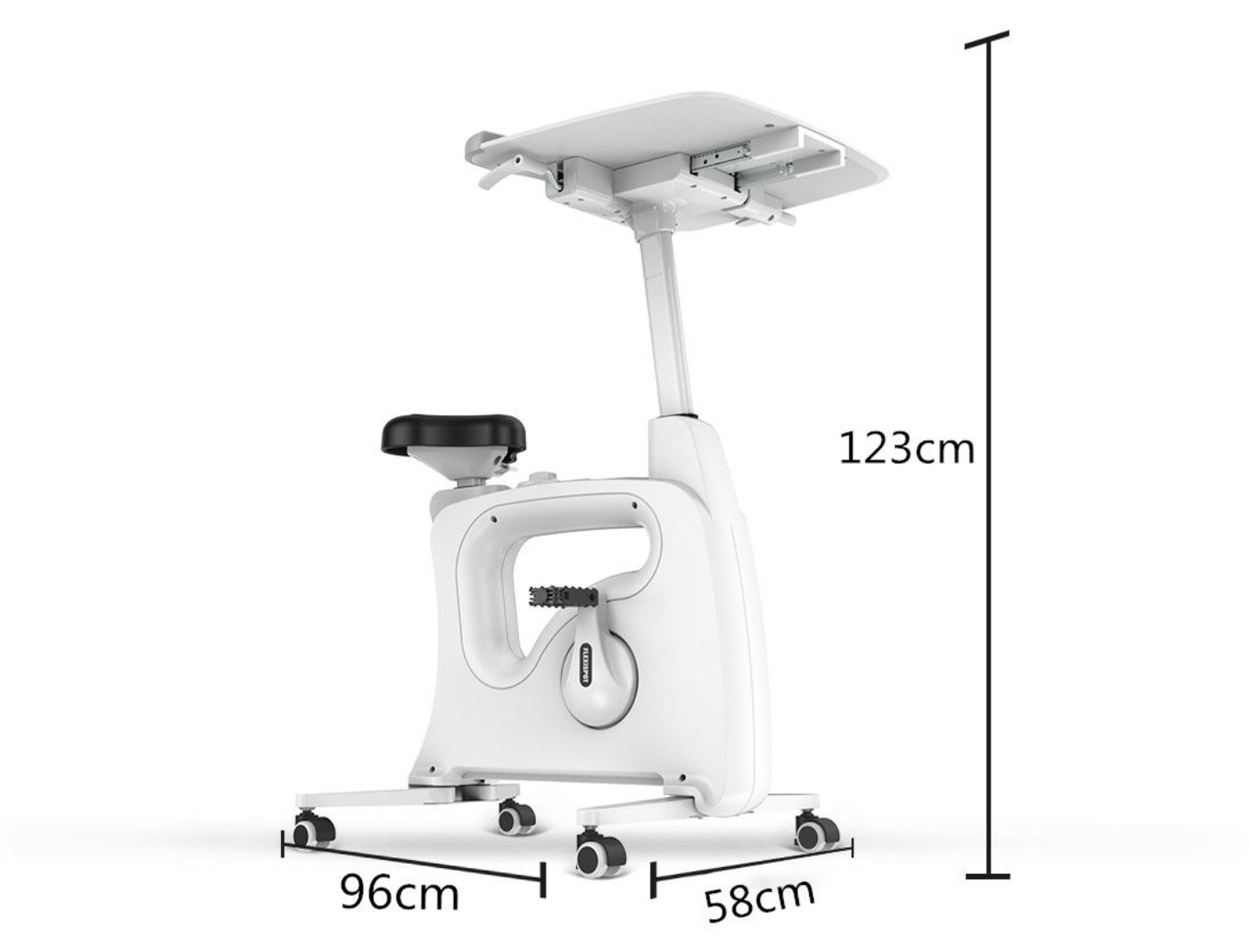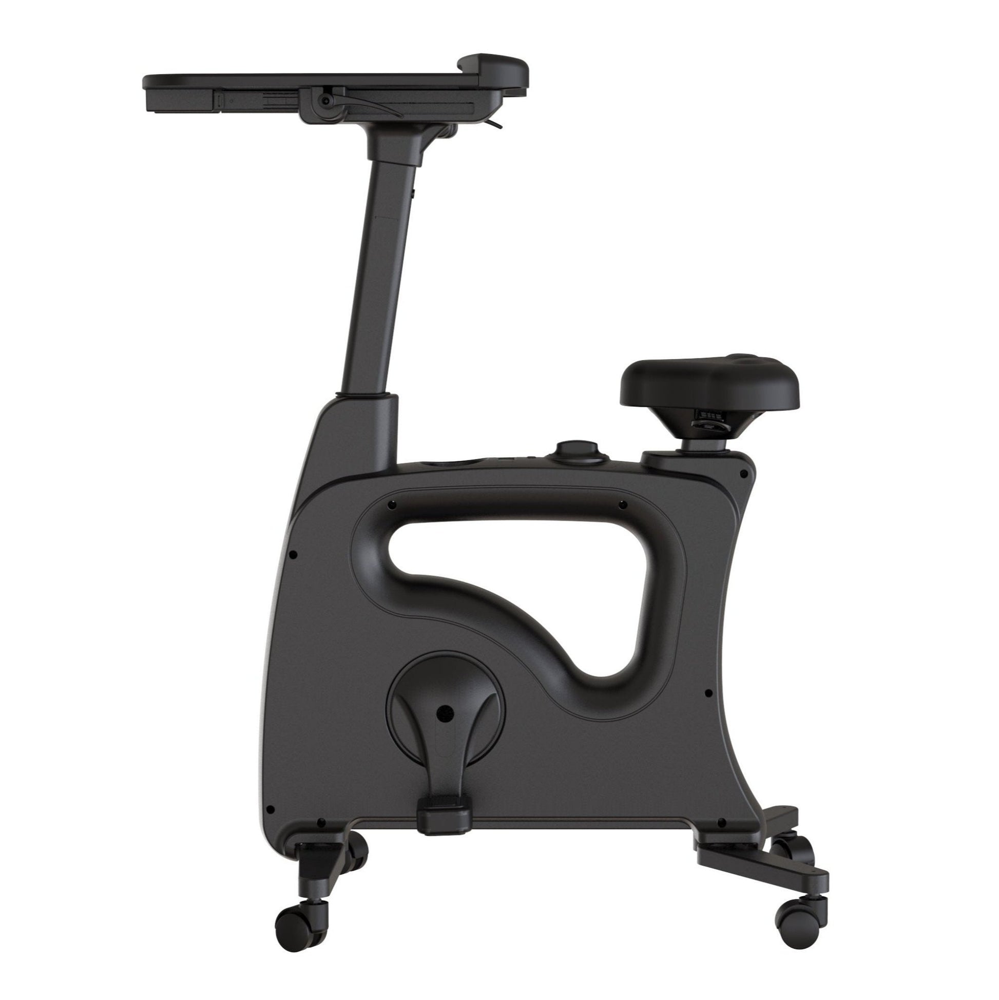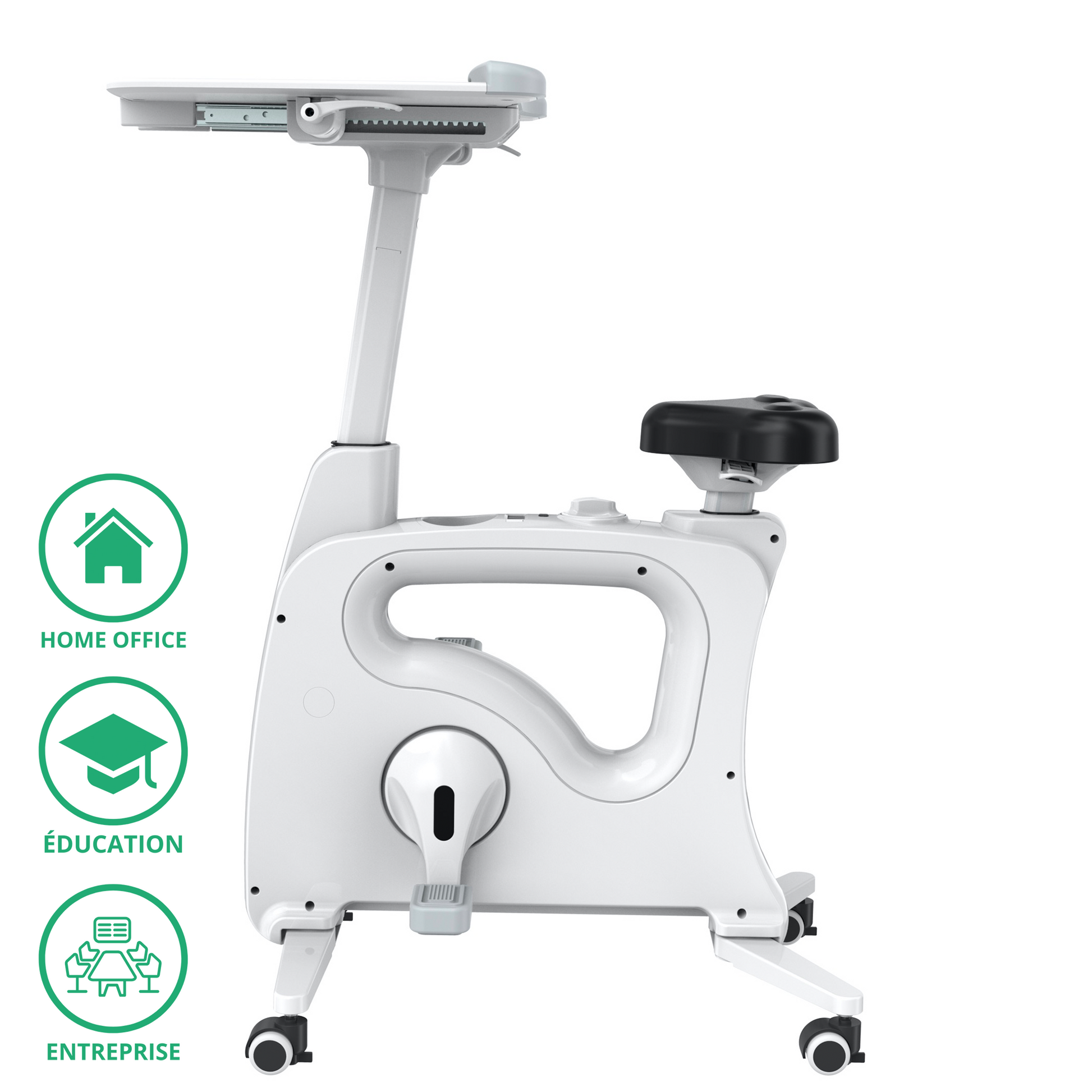 Les roulettes pivotent à 360° ce qui rend le vélo bureau maniable et facile à déplacer. Pour plus de sécurité les roulettes se bloquent lors de son utilisation.
